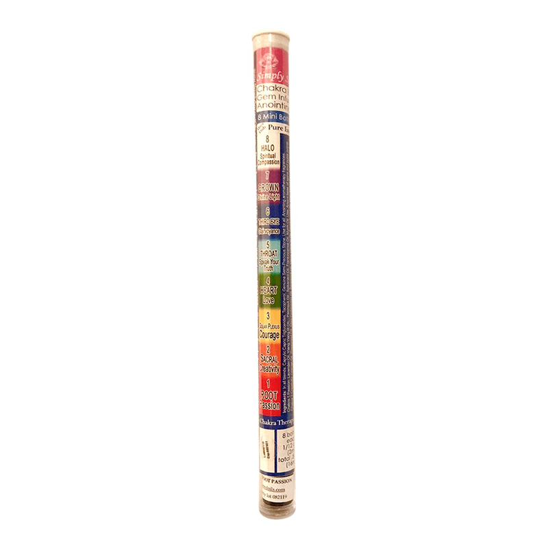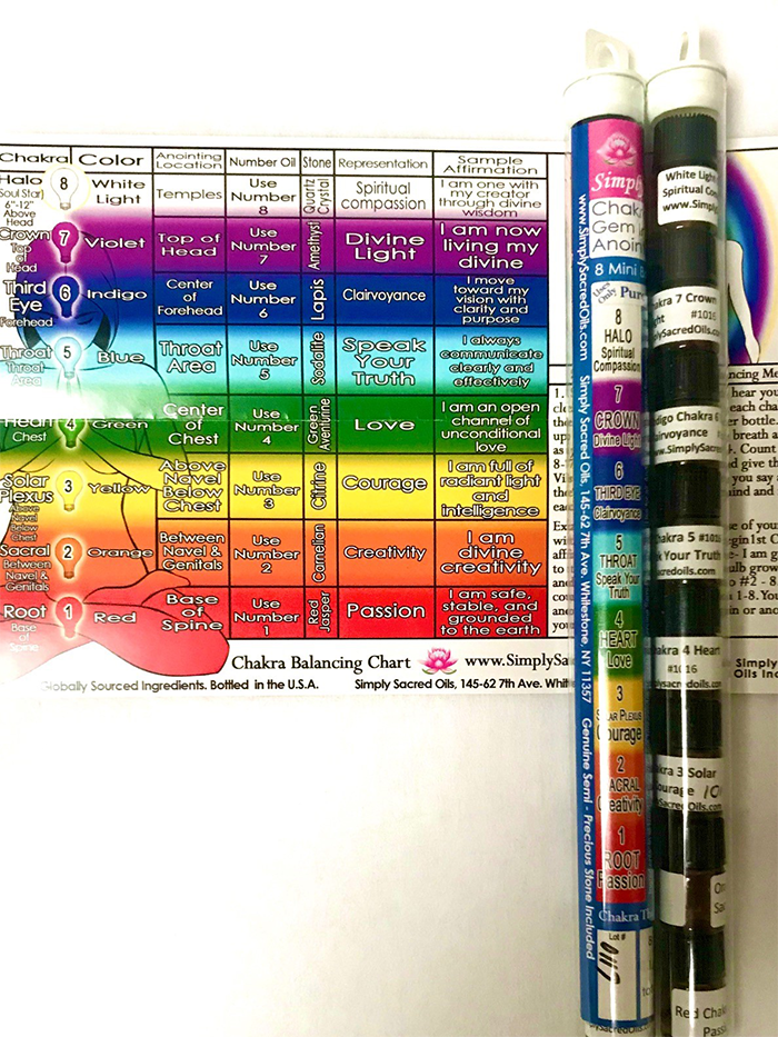A sampler size Chakra Balancing Aromatherapy Anointing kit. 8 – 2ml glass vials, one for each of the eight Chakras, in a travel tube with a Chakra chart and directions for suggested use. This nifty slim kit simplifies access to your ability to stay balanced and clear at all times. Genuine stones and crystals inside.