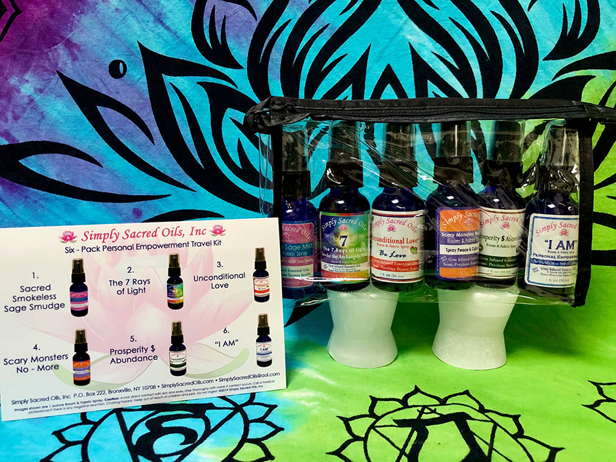 The sprays in this 6-pack are the Smudge Sage Mist™, 7 Rays of Light™, Unconditional Love™, Scary Monsters No-More™, Prosperity & Abundance, and “I AM”™. All in a clear travel tote as shown with an affirmation card and directions for suggested use.