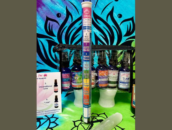 The items in this set include a 6-pack of travel size 1oz room and fabric sprays with carry case and affirmation card, a Chakra Balancing Gem infused Anointing Oil Sampler Kit, a 4-ounce bottle of Chakra Balance Body Mist, and an 6” Selenite Wand.