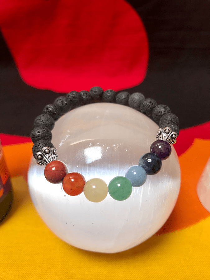 An 8 mm bead bracelet made from lava stones and genuine Chakra stones, one representing each of the seven Chakras. Stretch elastic for a comfortable fit.